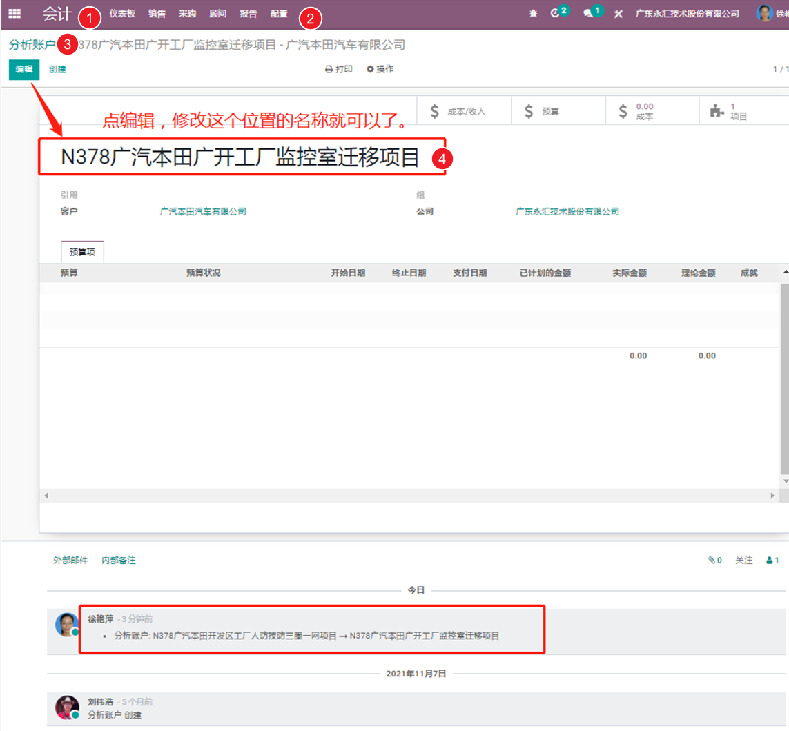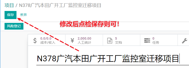 Odoo的项目名称修改是非常简单的,只要点击“编辑”,就可以随意的修改。